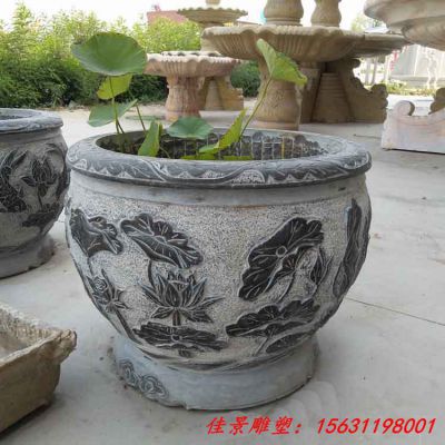 荷花石浮雕鱼缸青石仿古水缸雕塑