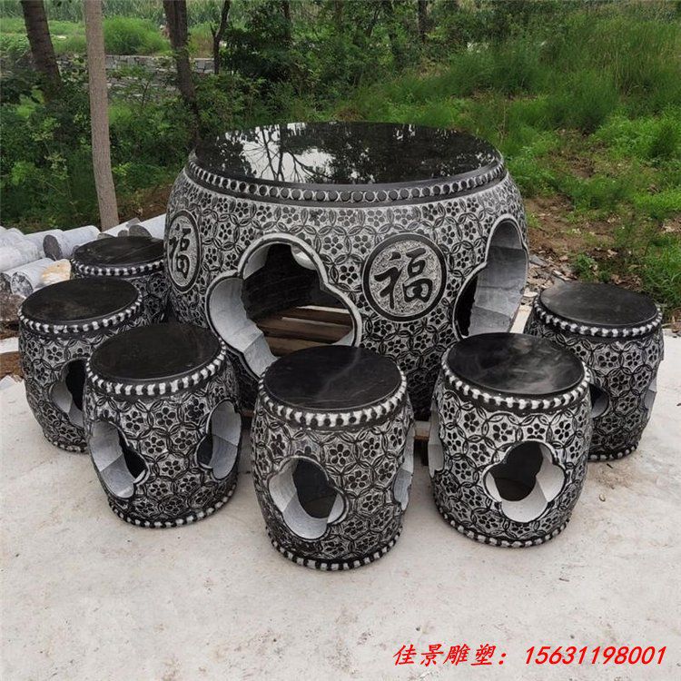 石桌凳工艺品雕刻是由各种石材制作而成,如大理石、花岗岩、青石、人造石,而汉白玉极其少用来制作石桌凳,因为,成本比较高,耐用度差。一般采用大理石和花岗岩制作,因为大理石和花岗岩不易破损,不易风化,款式多样。