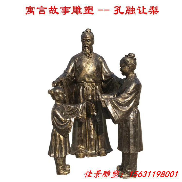 孔融让梨雕塑常被安放在公园、校园、广场等场所4。其目的是通过直观的艺术形式向人们传递 “谦让”“尊老爱幼” 等传统美德,起到道德教育和文化传承的作用